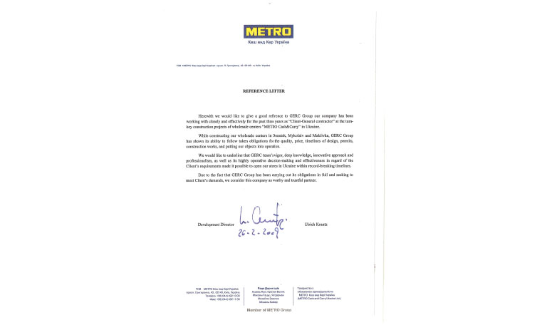 Рекомендаційний лист від директору з розвитку ТОВ "МЕТРО Кеш енд Кері Україна" Ульріха Кранза за внесок у будіництво магазинів МЕТРО в Україні